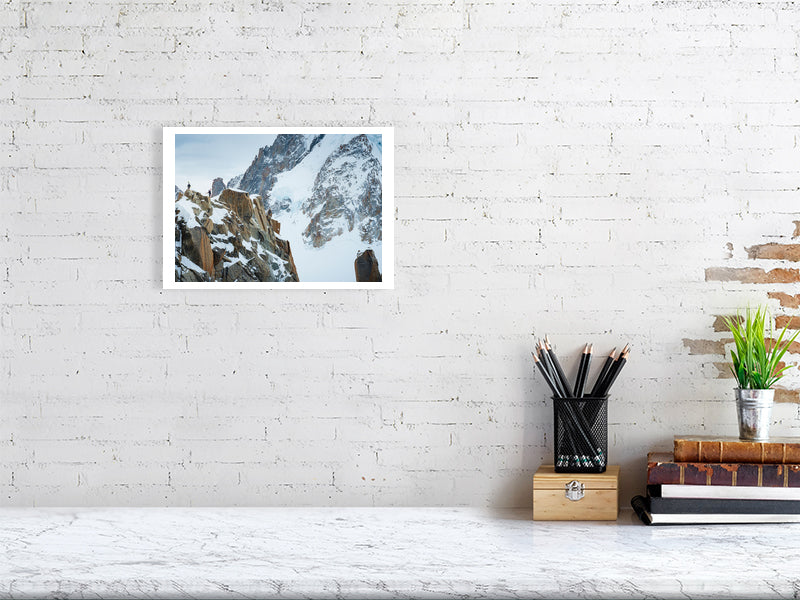 The Arête des Cosmiques in the Mont Blanc massif forms an apparently impenetrable climb to the Aiguille du Midi cable car station. The climber, with skis on his back, gives scale to the magnificent landscape in the stunning photograph